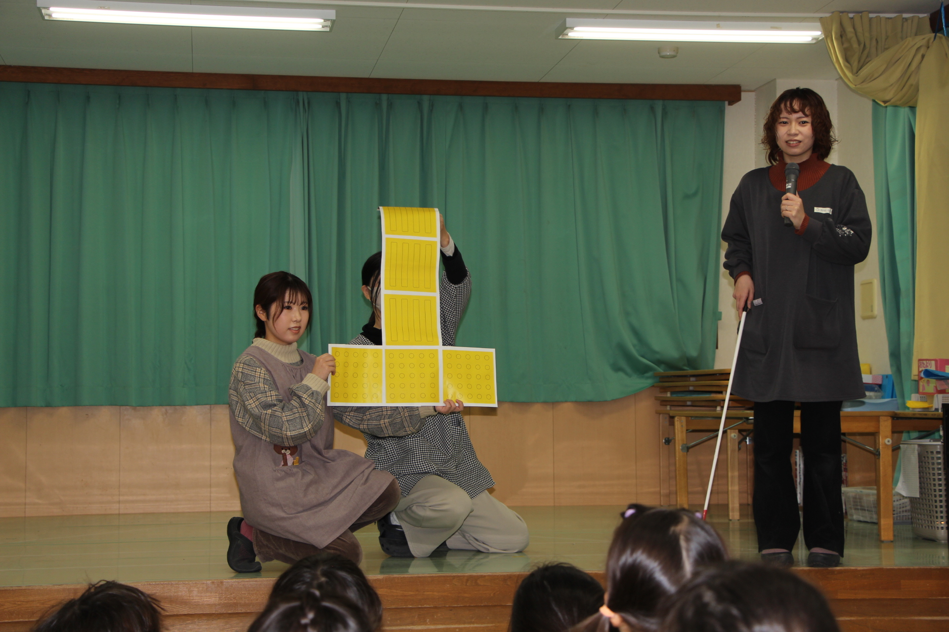 目が見えない人の生活を考えてみました。目が見えないとどんなことが不便なのか、それを補うためにどんなことが必要なのか、未満児は歩行者信号の音や、お風呂が沸く音などの生活家電の音、駅の改札の音など、『音』の工夫について、以上児は点字などの『触れる』工夫について、寸劇も交えながら写真を使って紹介しました。
