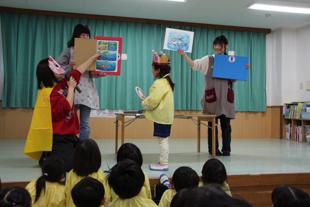 海や川にごみを捨てるとどうなってしまうかを劇を見ながら一緒に考えました。たちばなのお友だちは「さかながしんじゃう!」「およげなくなっちゃう!」と教えてくれ、ゴミ以外にも水の出しっぱなしで川や海の魚が住むことができなくなってしまうことを知り、ゴミのポイ捨てや水の出しっぱなしが及ぼす危険について理解を深めました。最後にはよりお魚に親しみ、身近に感じられるように劇に登場したお魚と一緒に『おさかな天国』を踊りました。