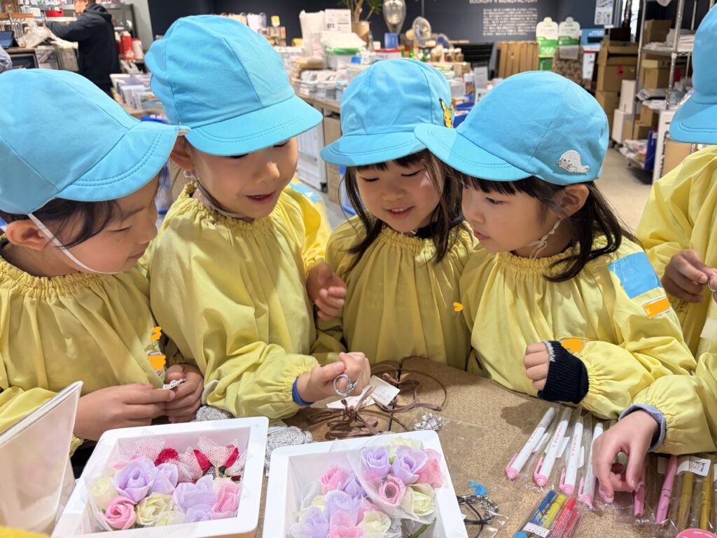 令和7年12月12日(金)に、リマーケット前橋リリカ店へ行きました。売っている品物を見せていただいたり、買い物体験をしたり、ラベル貼りをしたり、品物の補充をしたりと楽しいことの盛りだくさんでした。ナカダイさんに置いてある廃材と同じ物を見つけると、「え!これ、なかだいでみた!」「いきもの、つくったときにつかったよね!」と話す姿が見られました。買い物体験では、机いっぱいに並んだ品物を見て「かわいい~♡」「こんなにあったら、まよっちゃう~!」とお気に入りの品物を選んでいました。ラベル貼りでは、ハンドラベラーを使い、グリップを握ると先端から値札が出てくる仕組みに、子どもたちは興味津々。「でてきた!」と、手に伝わる感覚を楽しみながら、夢中になって取り組んでいました。品物の補充では、自分が貼りつけた品物を持って商品棚へ行くと、「とみかはここ!」「ぬいぐるみはこっち!」と本物の店員さんのように補充する姿が見られました。