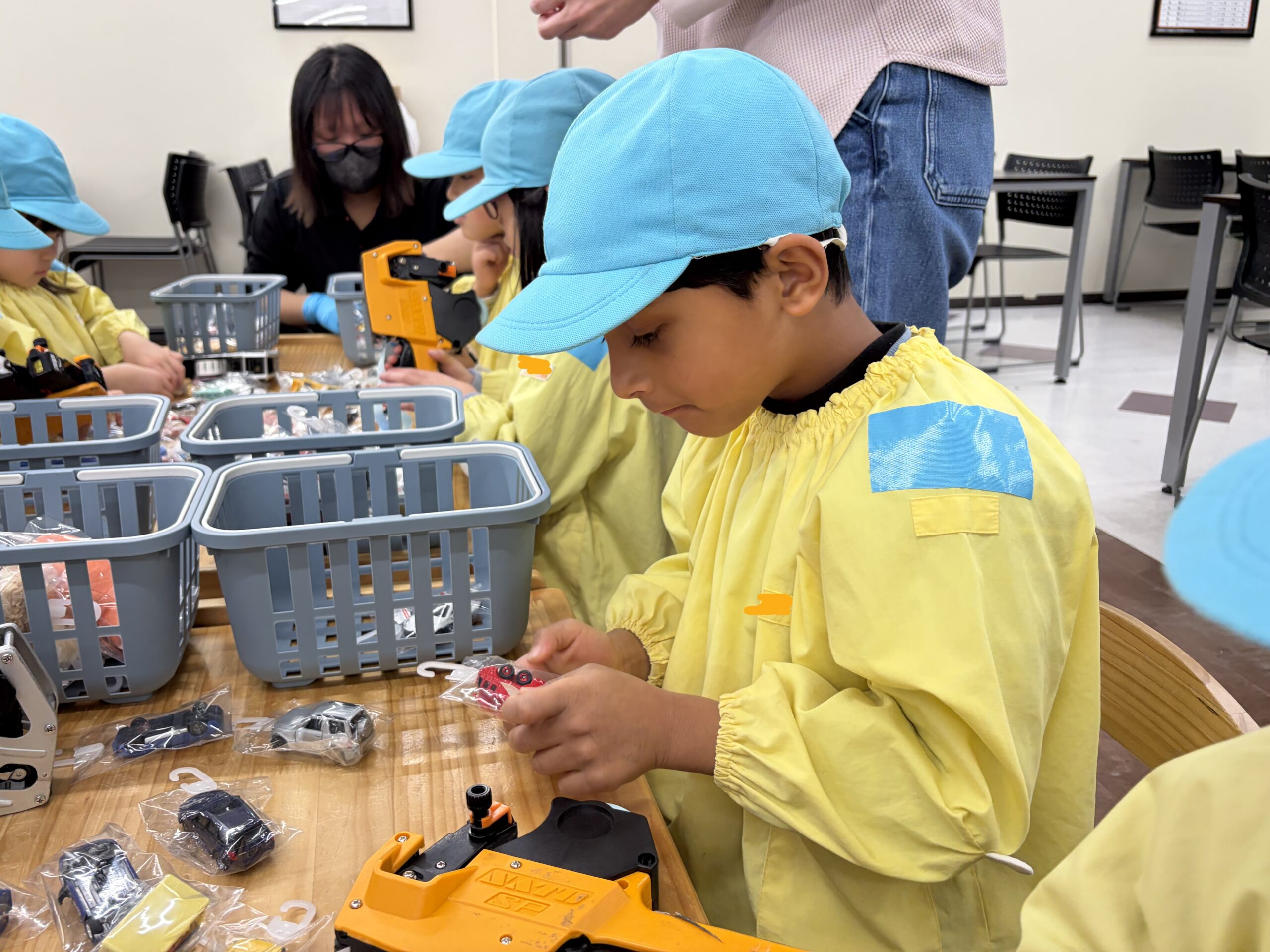 ナカダイがどんなところかについて話を聞いたあと、2チームに分かれて工場の中へ。トラックスケールに乗って、みんなの合計体重は何キロなのか知ったり、ジャンプをしたりして楽しんでいました。実際に粗大ゴミを集めたトラックがやって来て、どのようなものを積んでいるのか、どうやって降ろしているのかも知ることができました。また、マットレスを分解しているところやプレスされたものを見させていただき、貴重な時間を過ごすことができました。その後は、沢山の廃材の中から”これだ”というものを選んで、自分だけのオリジナル生き物を作りました。
